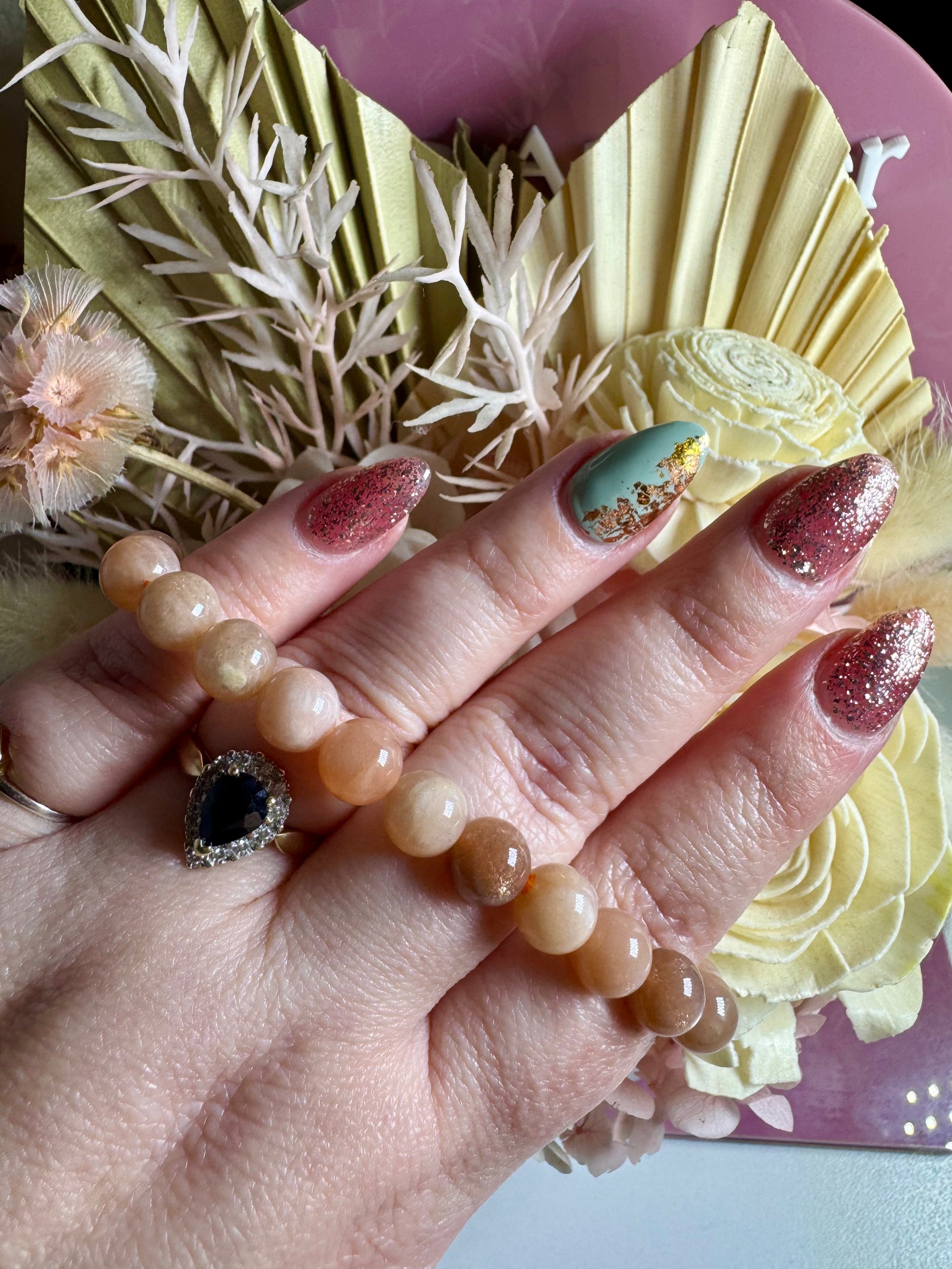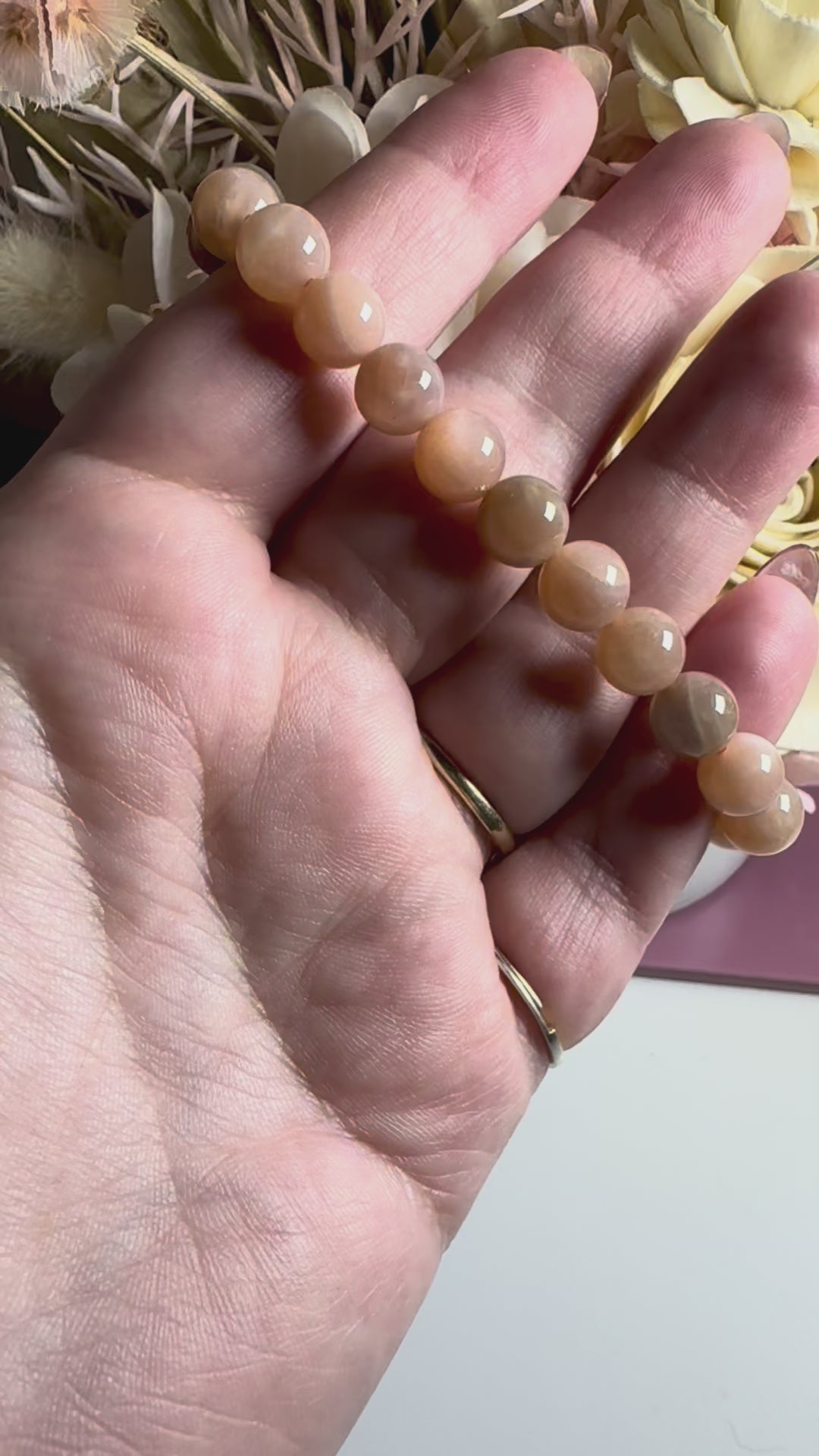 Peach Moonstone in particular is associated with soothing emotional energies, promoting self-love, and easing worry. Metaphysically, it is believed to support intuition, calm the mind, and encourage a sense of peace and compassion, making it a nurturing companion for emotional healing and new beginnings.