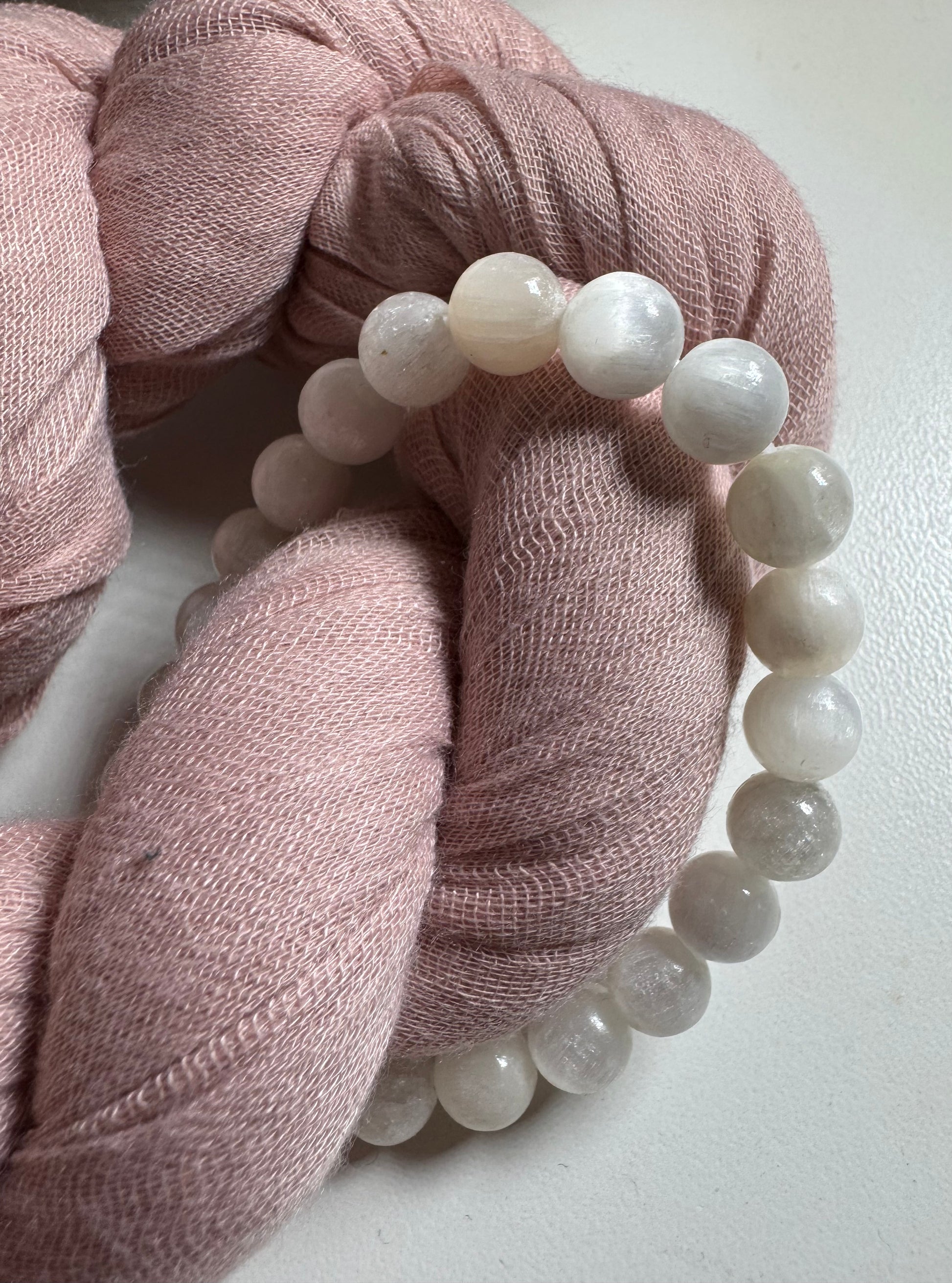 Selenite, often referred to as satin spar when in its fibrous form, is a variety of gypsum known for its luminous, silky sheen and soft, pearly glow. The name “selenite” comes from the Greek word selēnē, meaning “moon,” as its shimmer was thought to resemble moonlight. Found in countries such as Mexico, Morocco, and the United States, selenite has been used throughout history for decorative carvings, windows in ancient architecture, and spiritual practices.