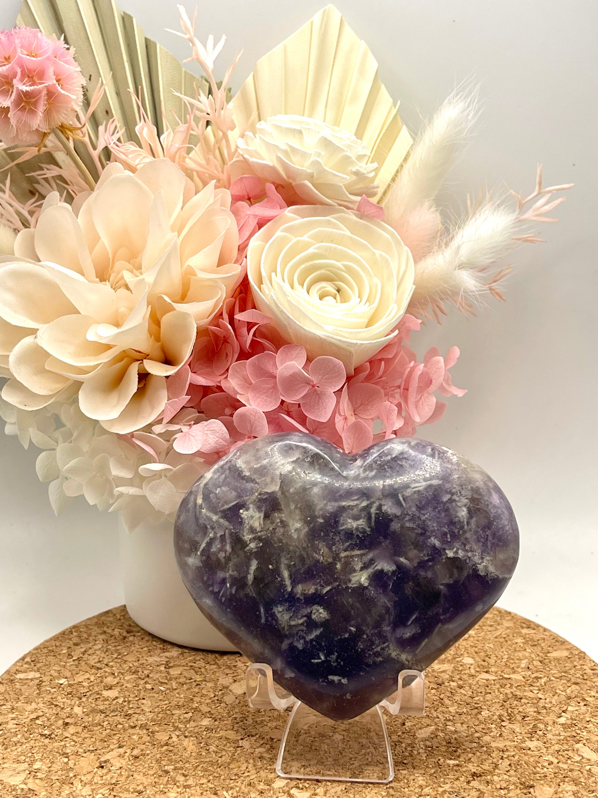 A Lepidolite Heart is a stone of transition that dissipates negativity, promoting harmony and stress relief. It is known to help with exhaustion and insomnia, making it a helpful stone for meditation. Additionally, it stimulates one's intellect and encourages independence, self-love, and trust. Its properties can also clear electromagnetic pollution, creating a sense of serenity.