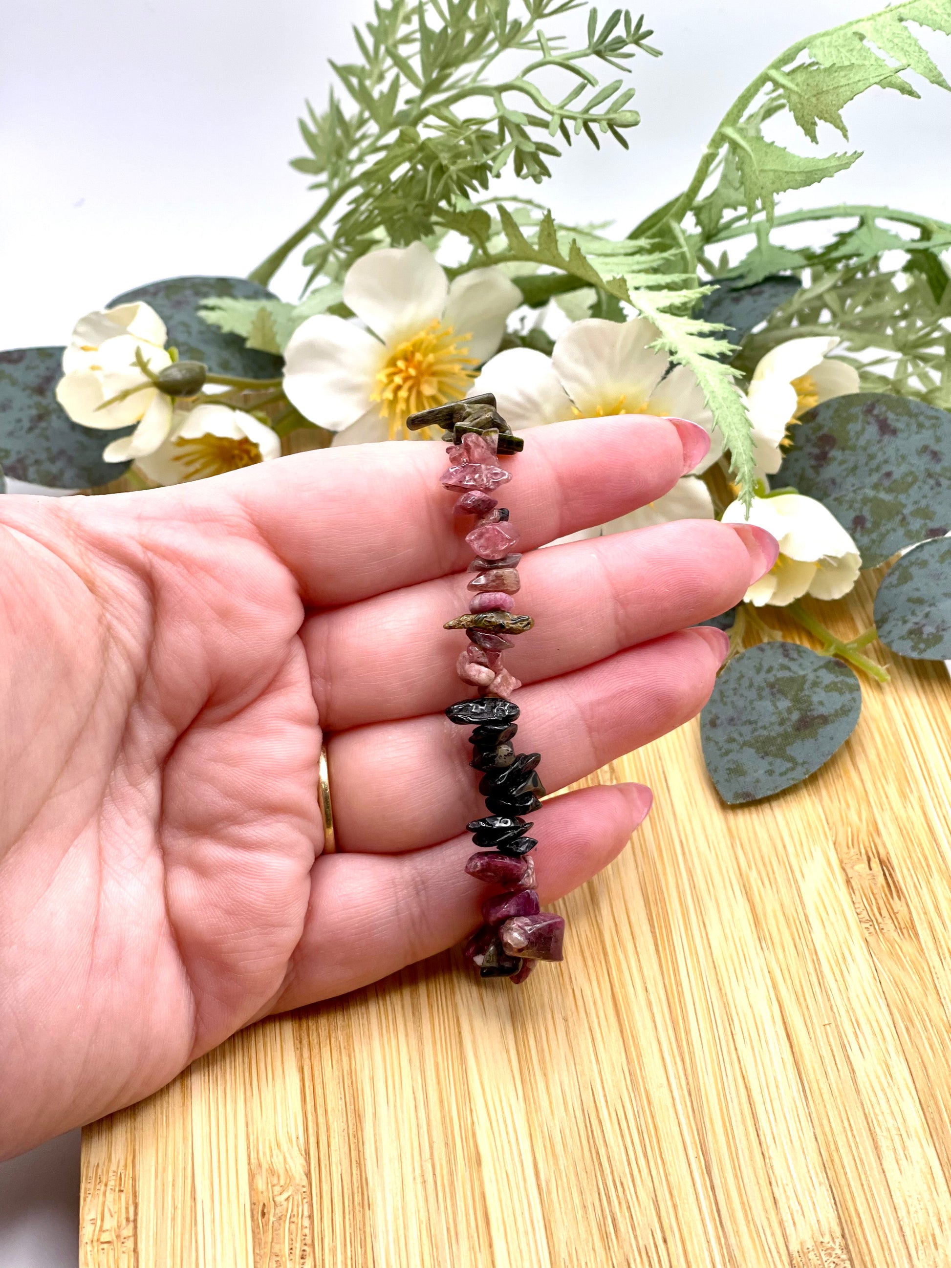 Mixed Tourmaline Chip Bracelet Give yourself a simple, stylish pick-me-up with this unique bracelet! Not only will you get to show off its beautiful multi-colored stones, but it's also said that Tourmaline works to neutralize negative energies. A fashionable way to protect yourself!