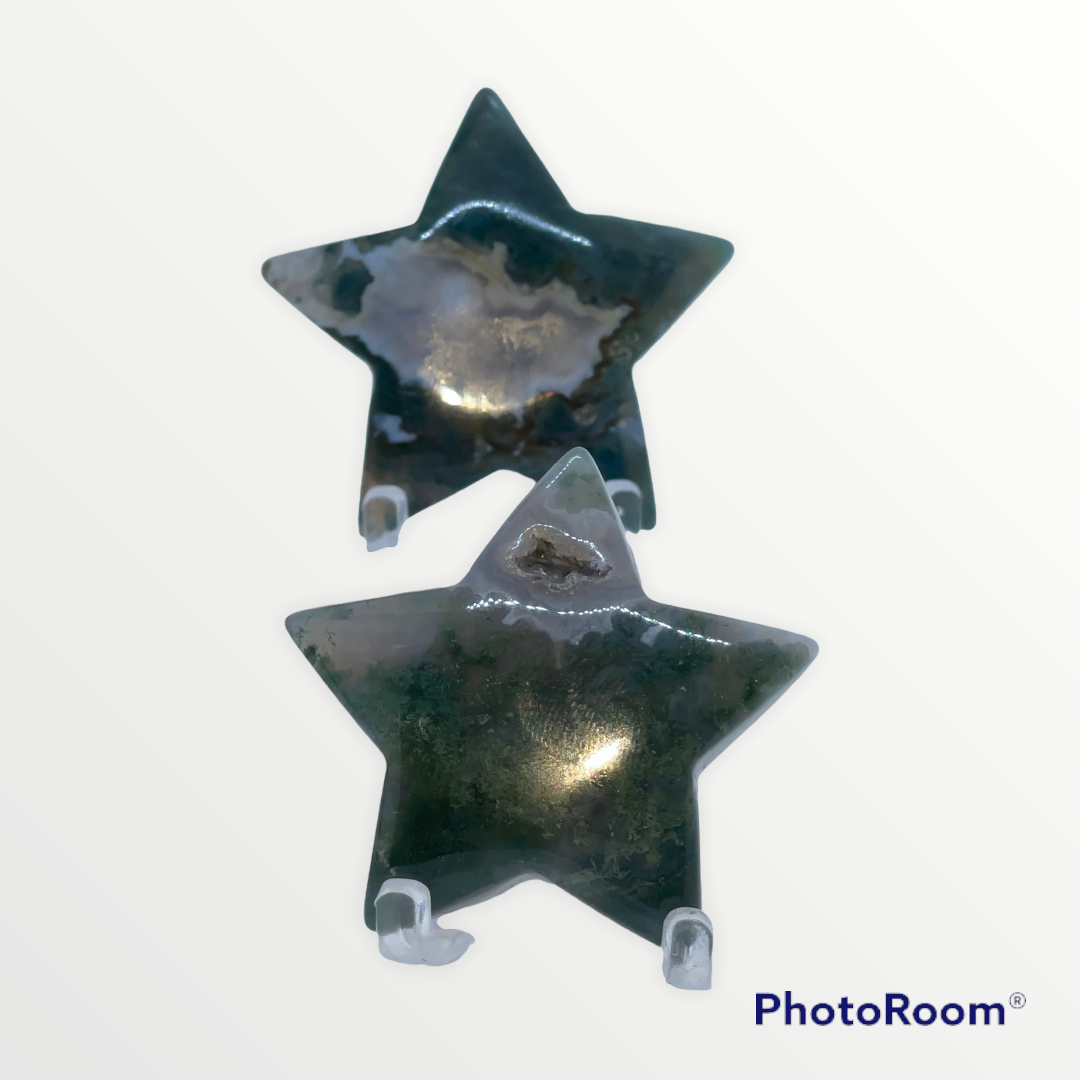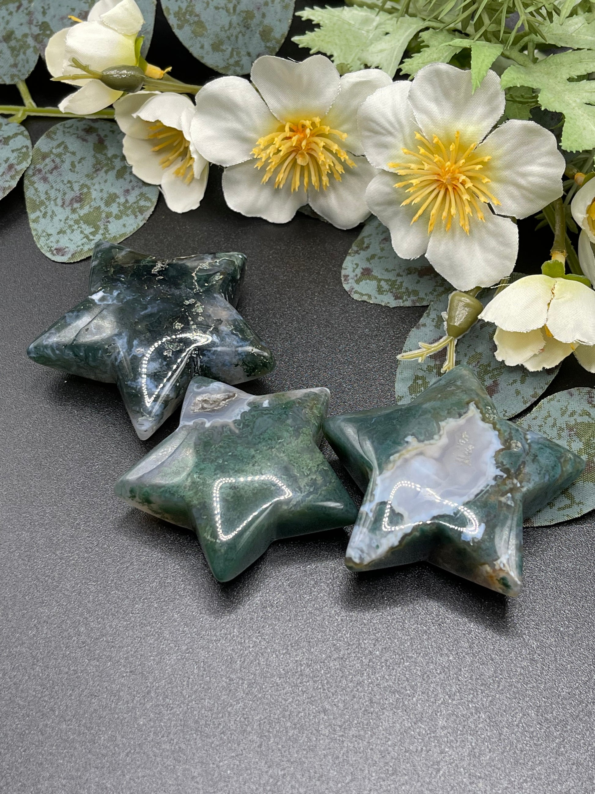 Moss Agate is calming and connected to nature. It's said to freshen the soul and make beauty visible. For those working in agriculture or botany, it brings peace and stability. Its clear energy links us to Earth. It can help manifest desires and reach goals and is associated with prosperity. It helps bring vitality and mission into daily life, and if placed around the chest or kept in a wallet, it can attract wealth.