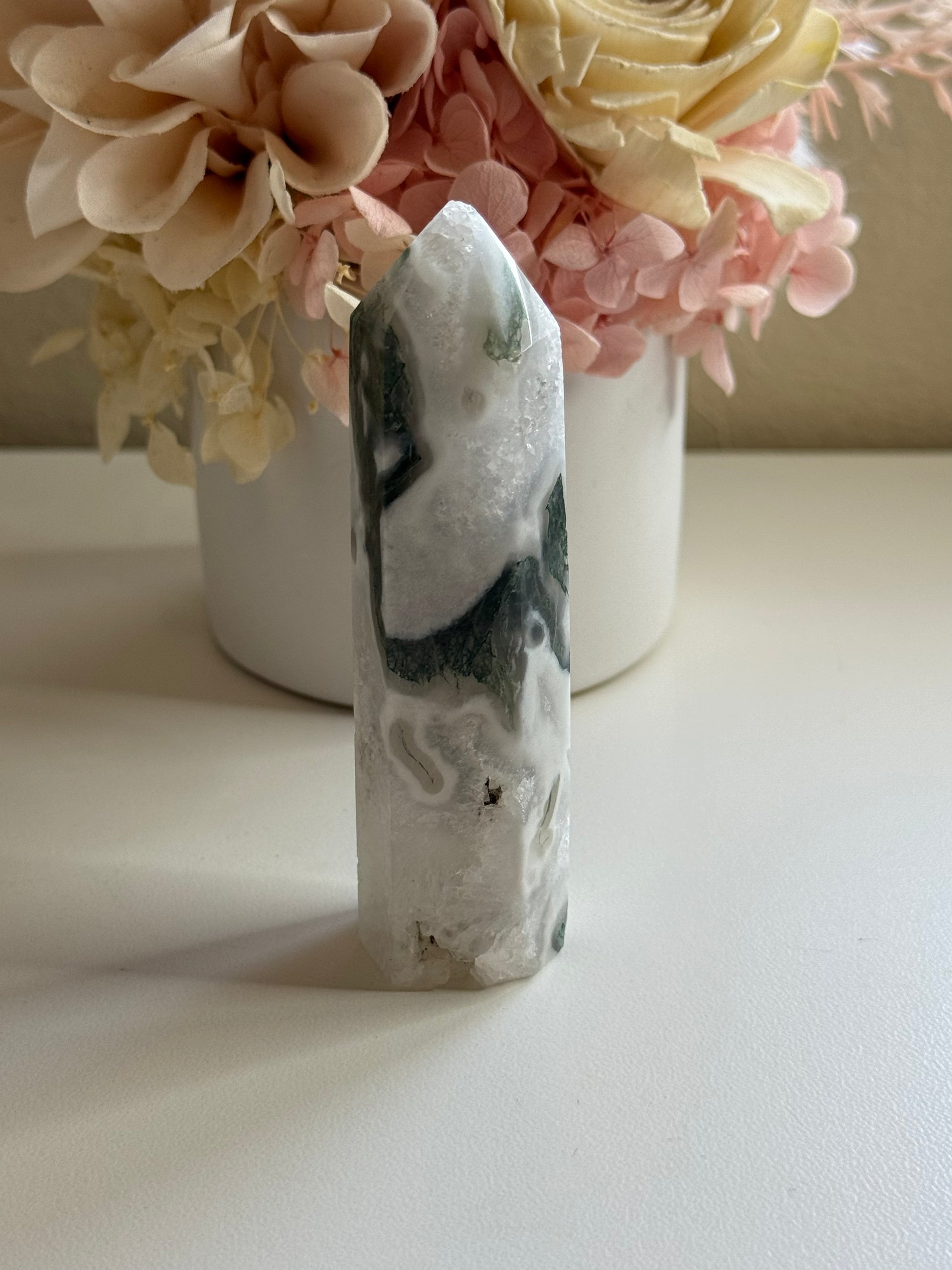 Moss Agate is a beautiful green-and-white chalcedony known for its leafy, garden-like patterns formed by minerals trapped within the stone. Found in places like India, Brazil, and the United States, each piece is completely unique—like a tiny landscape frozen in time.