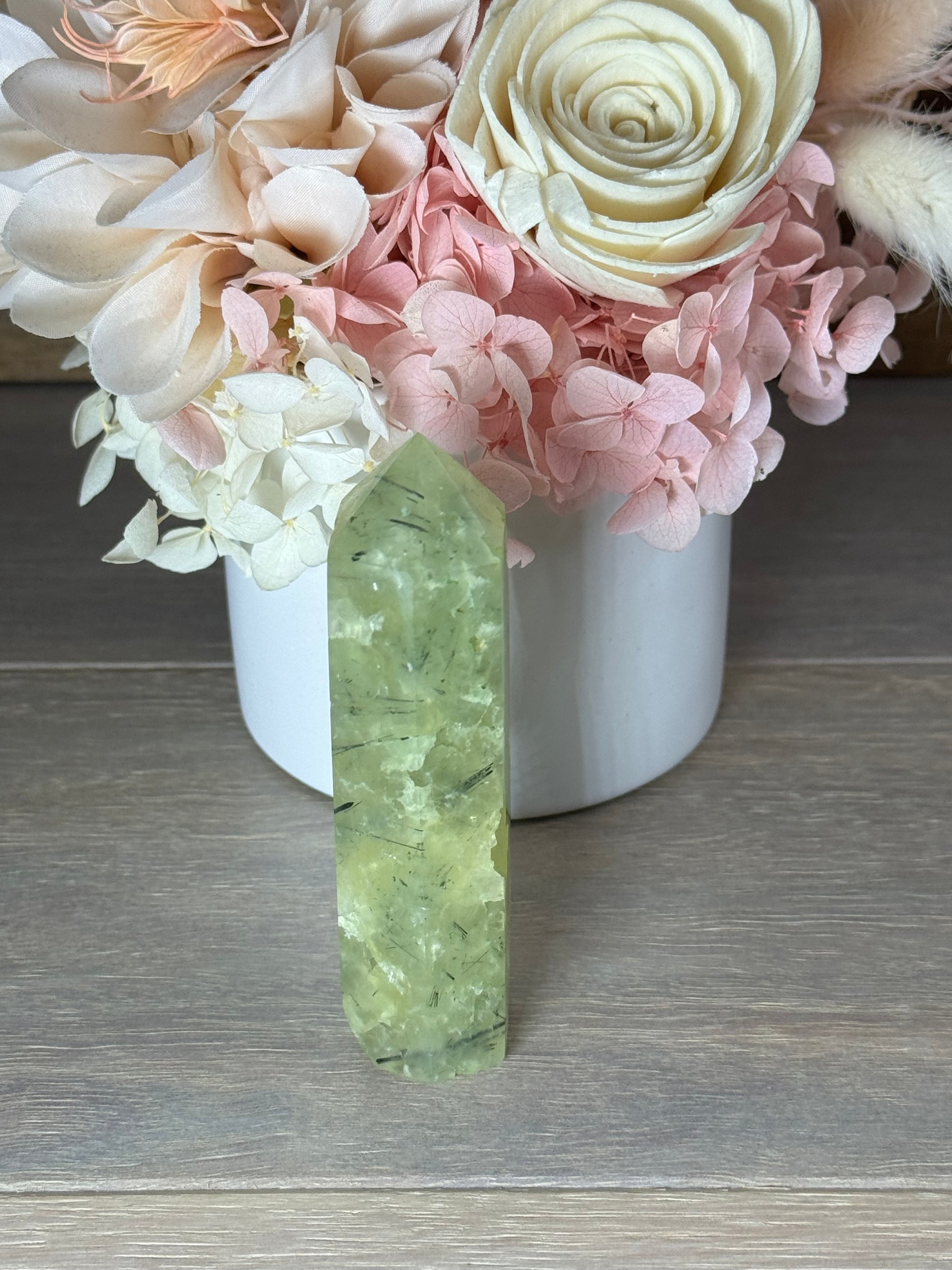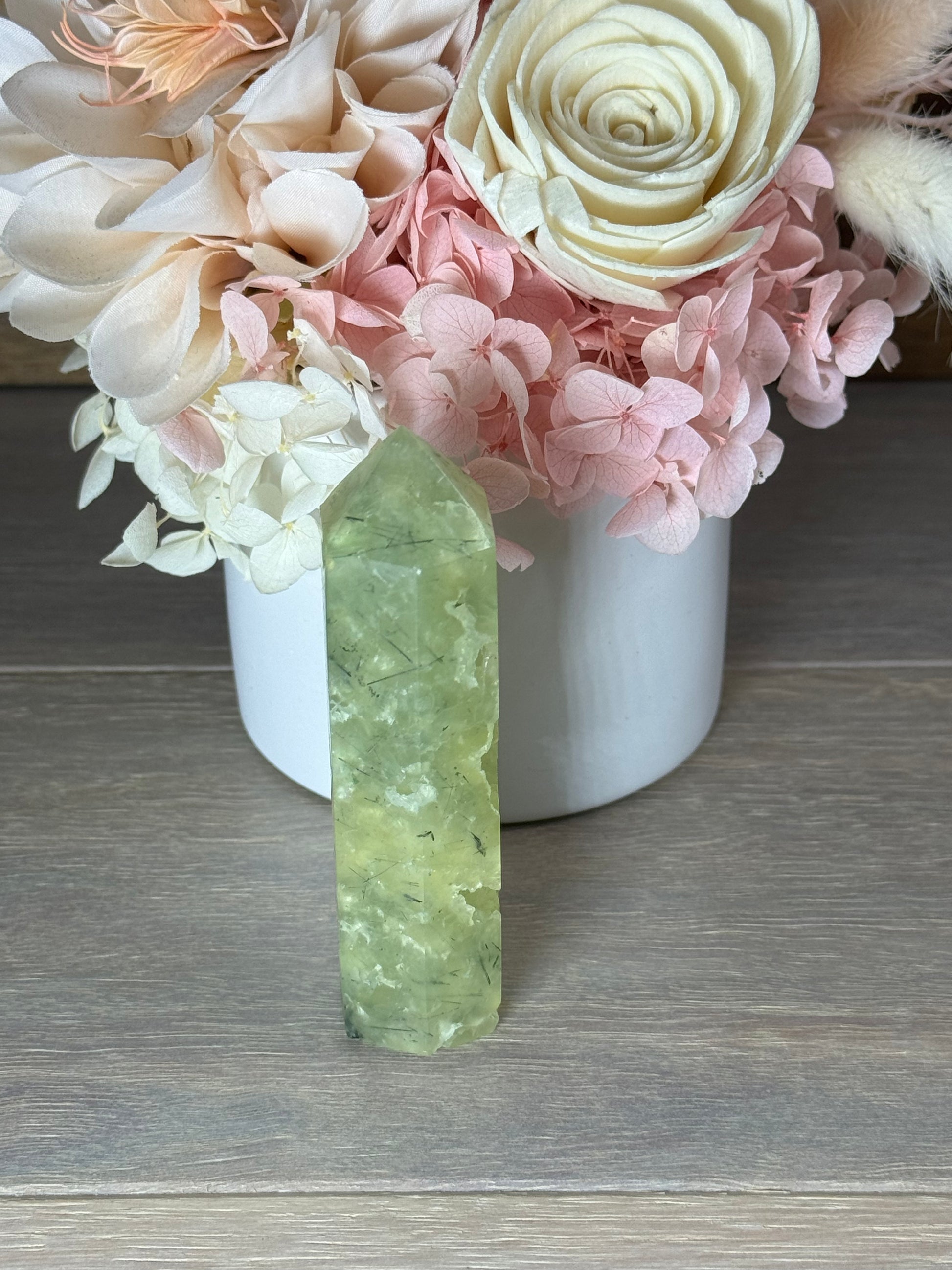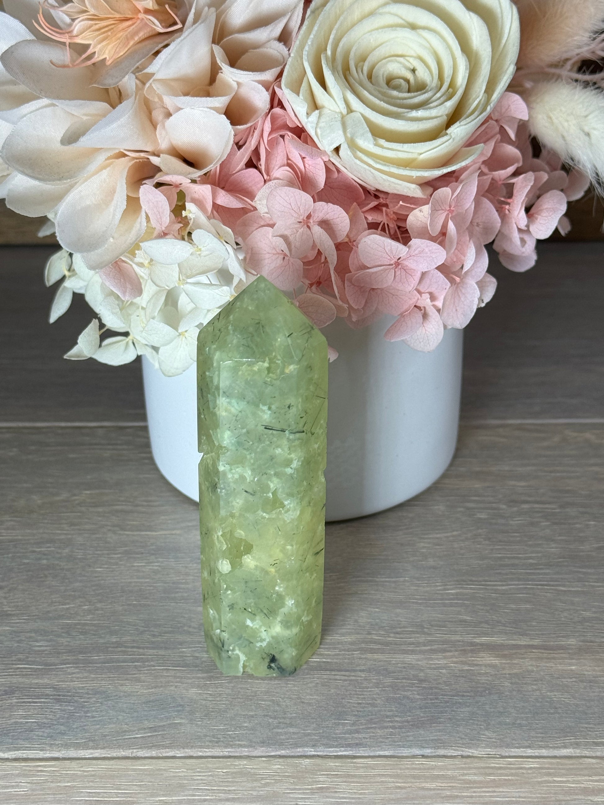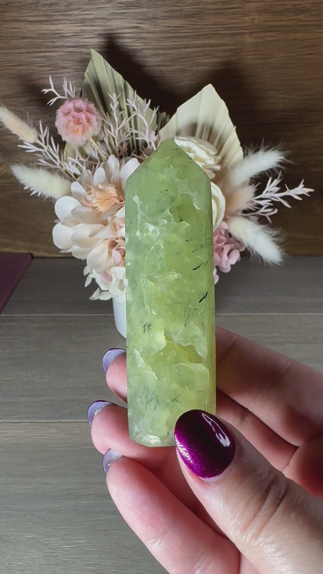 Prehnite is known for its power to aid lucid dreams, chase nightmares, and promote communication with other realms. It's said to be calming and can lessen anger, nervousness, and worries. It can help to cleanse your aura, get in touch with nature, and offer a direct connection to your solar plexus chakra. By meditating with Prehnite, it can help you realize your intentions and purpose. Use this stone daily to stay committed to your goals and bring about the reality you desire.