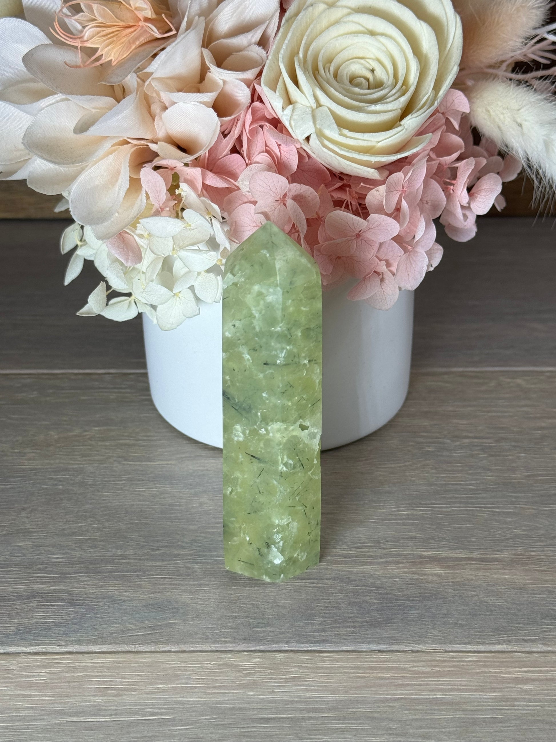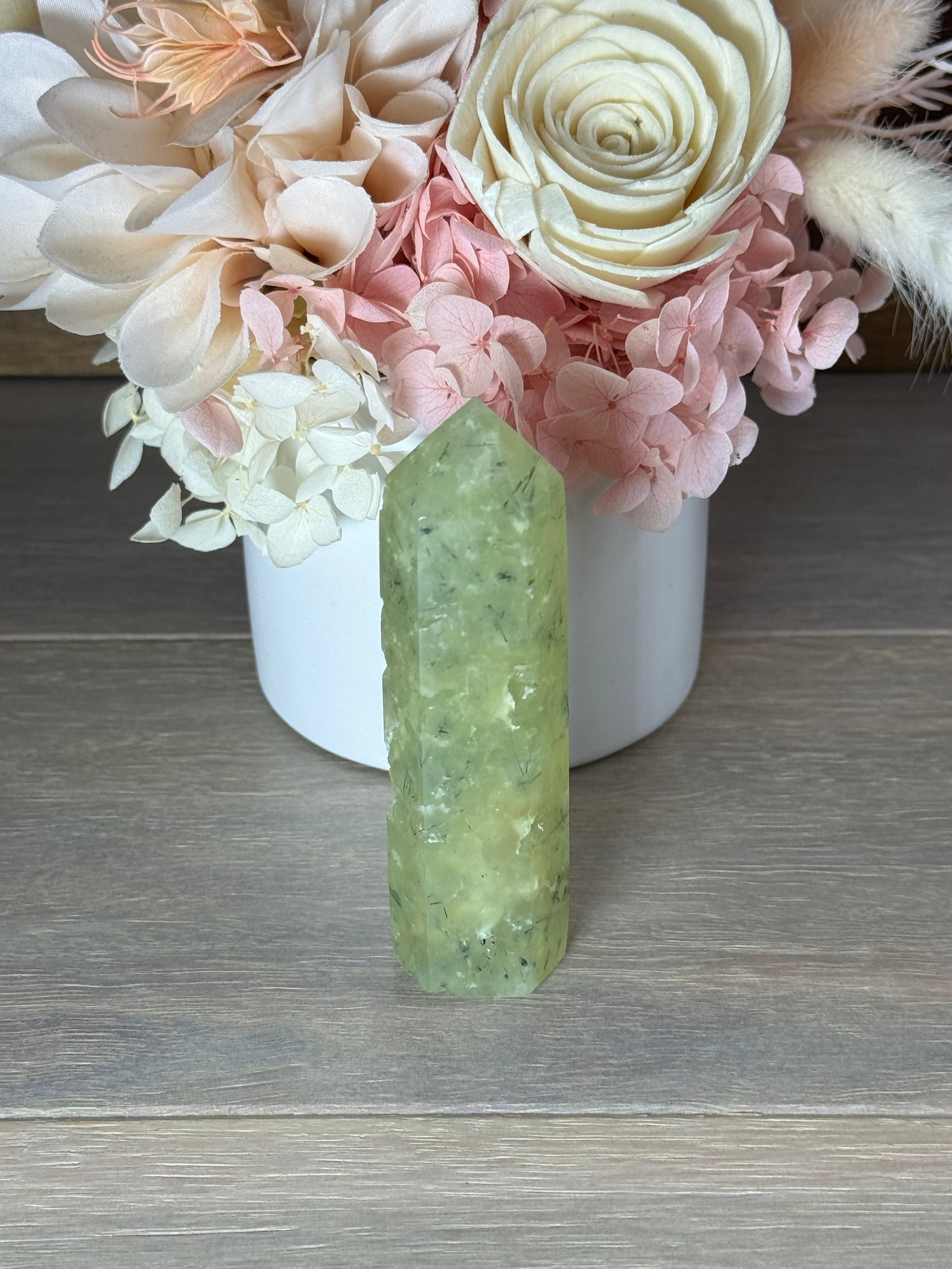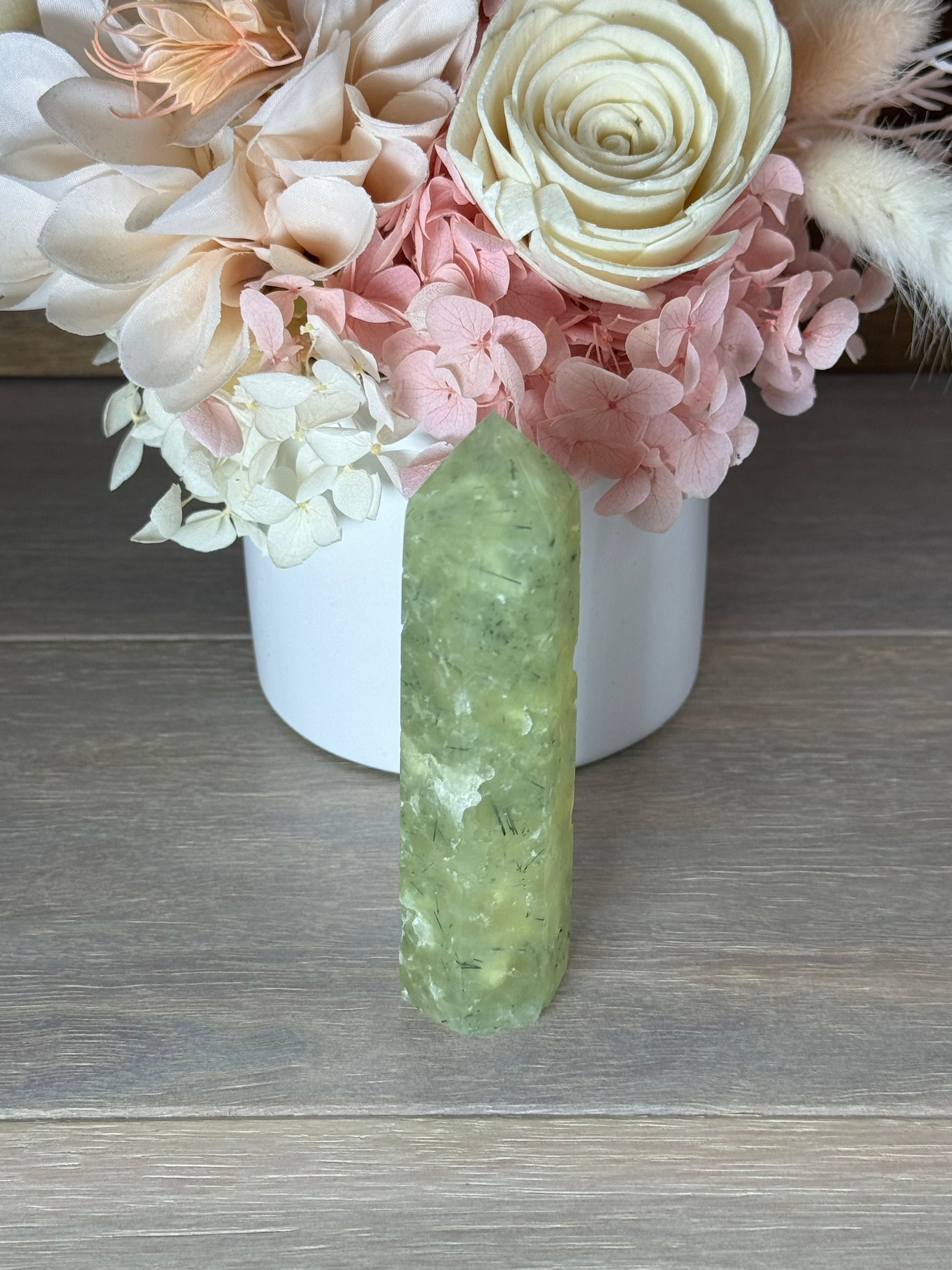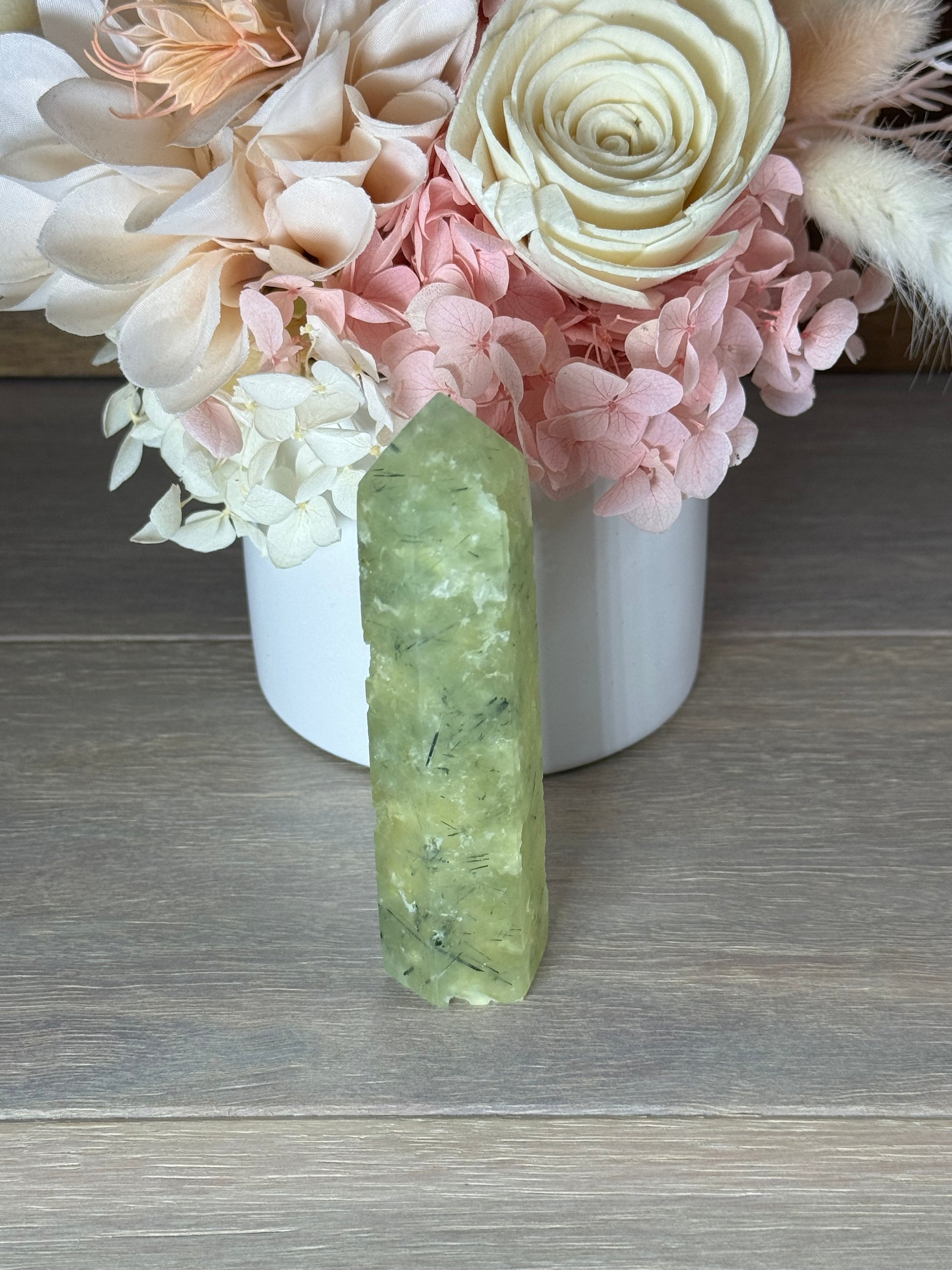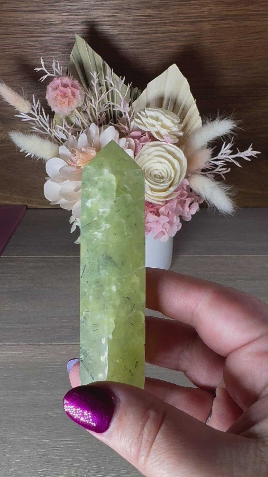 Prehnite is known for its power to aid lucid dreams, chase nightmares, and promote communication with other realms. It's said to be calming and can lessen anger, nervousness, and worries. It can help to cleanse your aura, get in touch with nature, and offer a direct connection to your solar plexus chakra. By meditating with Prehnite, it can help you realize your intentions and purpose. Use this stone daily to stay committed to your goals and bring about the reality you desire.